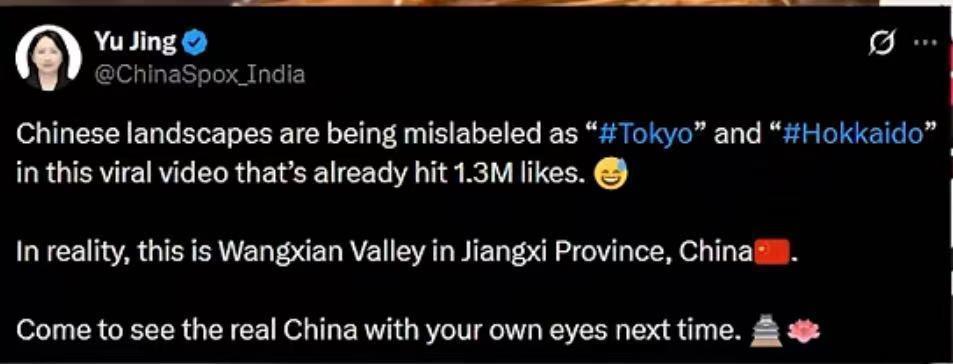 另据极目新闻12月10日报道,上饶望仙谷美景视频在外网爆火,然而有账号将视频地点错误标注为日本东京和北海道。12月8日,中国驻印度大使馆发言人宇静在社交平台X上发帖辟谣称:“这段获130万点赞的热门视频里,中国的风景被错误标注为东京和北海道。实际上,这是中国江西望仙谷。请你们亲自来中国,看看真正的中国吧。”该辟谣帖迅速引起国内外网友关注,望仙谷也因此爆火出圈,受到不少关注。