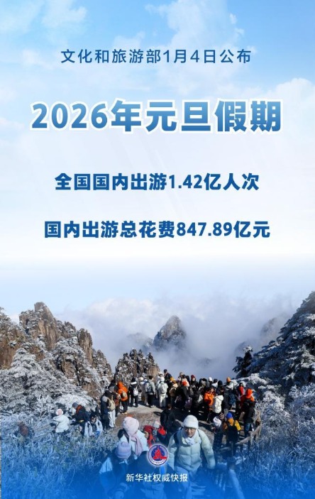 文化和旅游部1月4日发布:元旦假期3天,全国国内出游1.42亿人次,国内出游总花费847.89亿元,文旅消费活力持续释放。