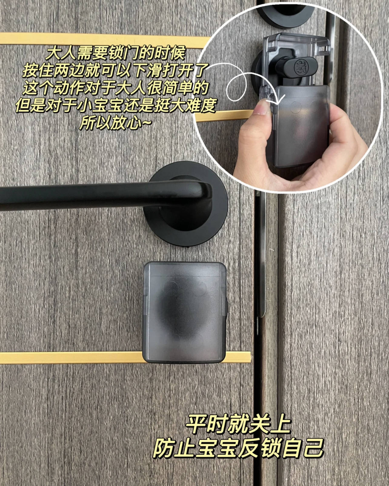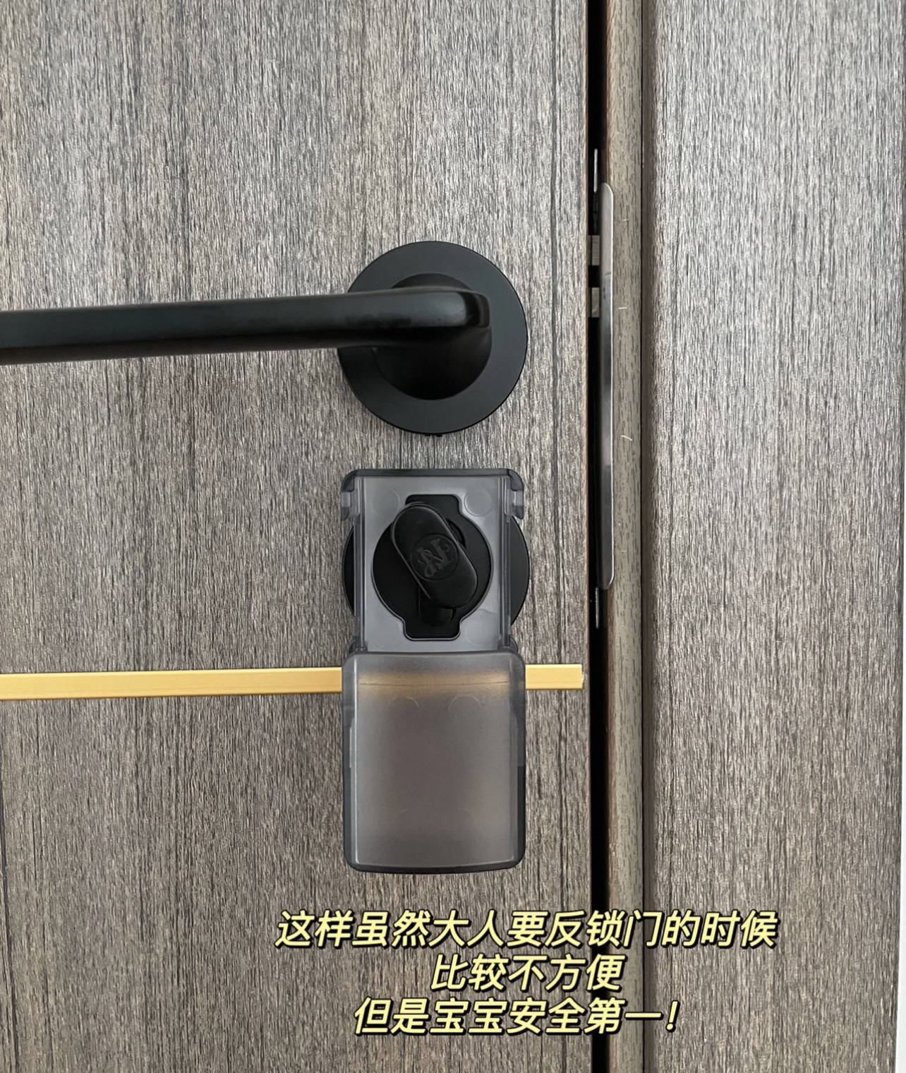 安装很简单,就是直接套在反锁的那个旋钮上就行,大人可以按压打开,但小宝宝是完全打不开的,防护作用还是不错的。