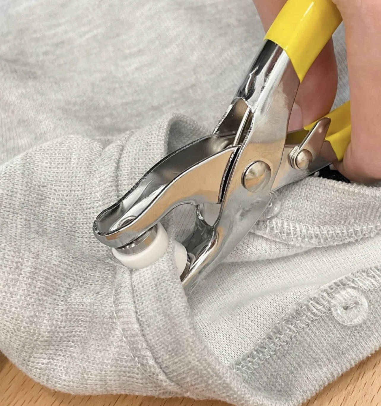 对于宝宝的上衣领口大、口水巾没有扣子、裤腿不合适等,用五爪扣安装工具都能解决,直接把扣子卡上去,使劲一捏,就牢牢的固定住了。